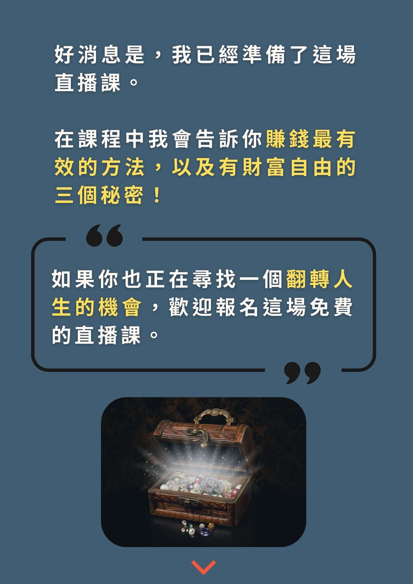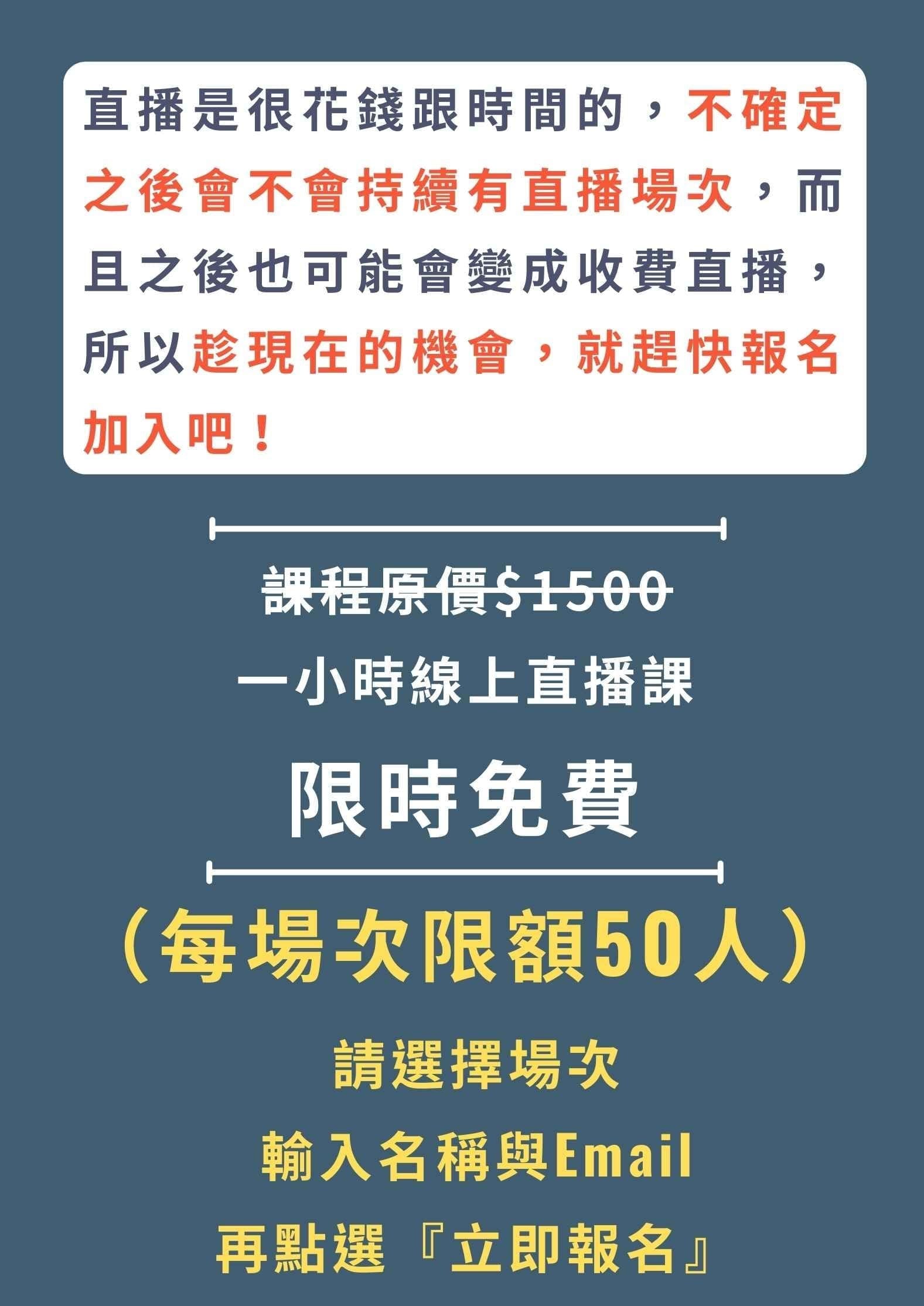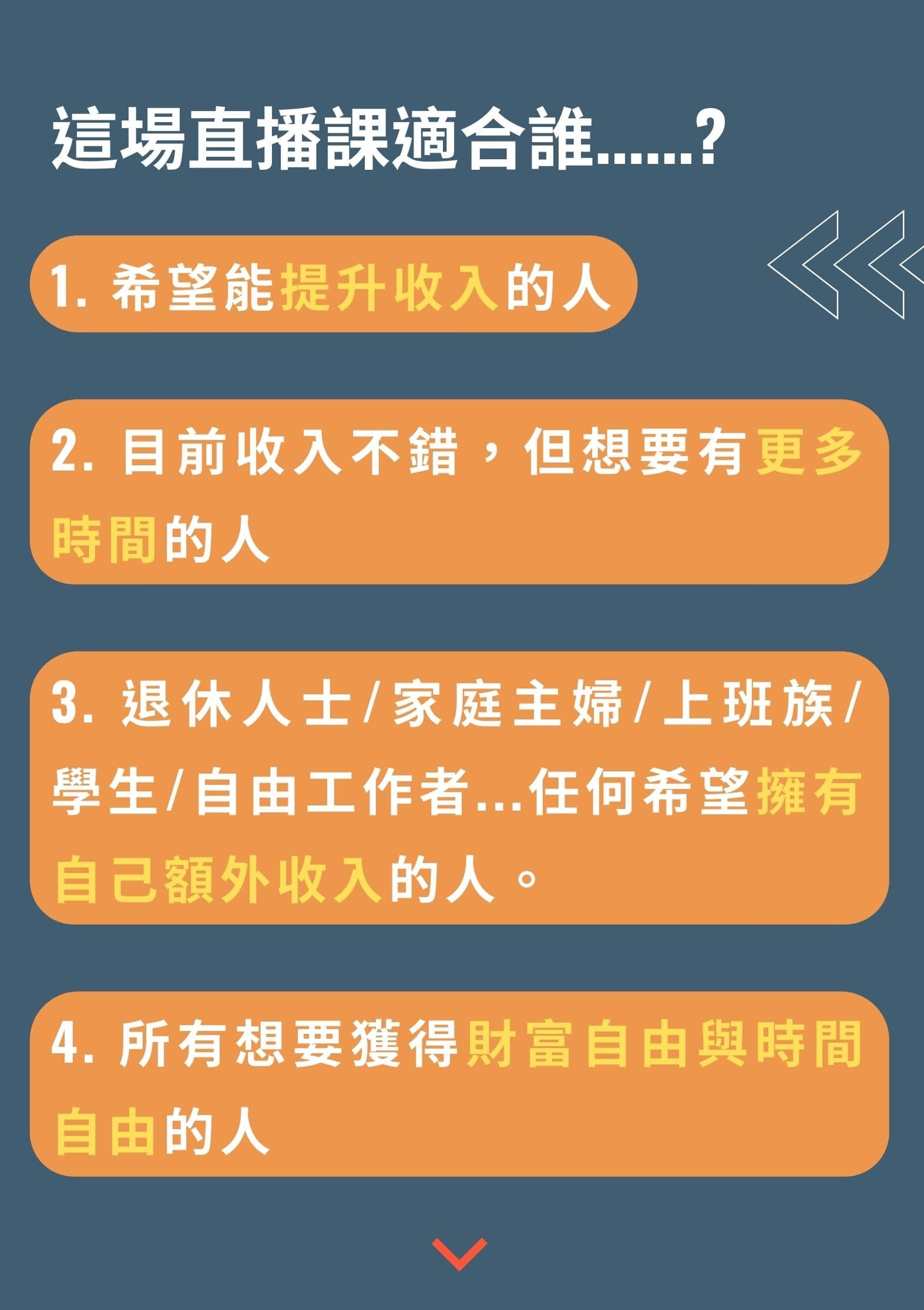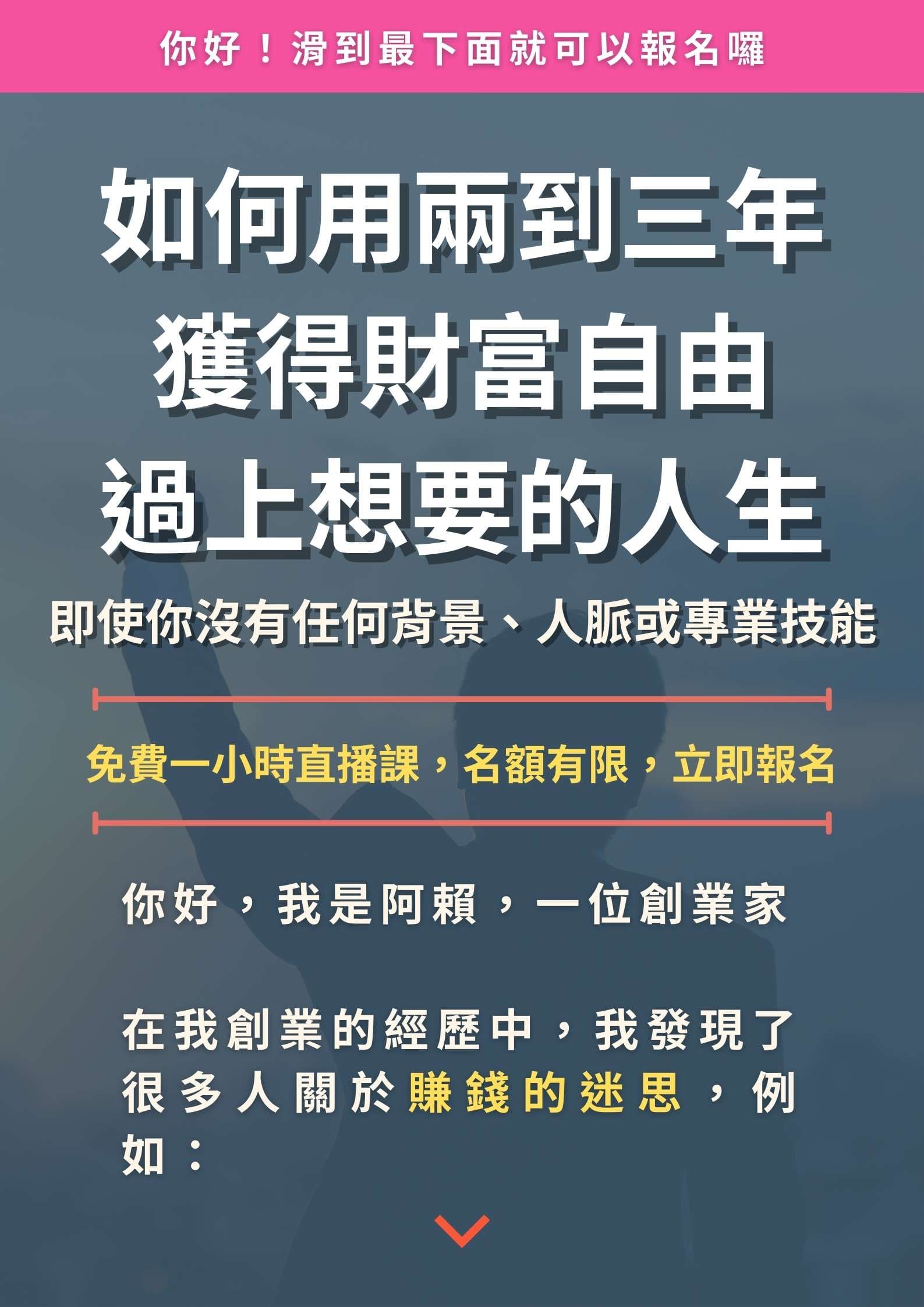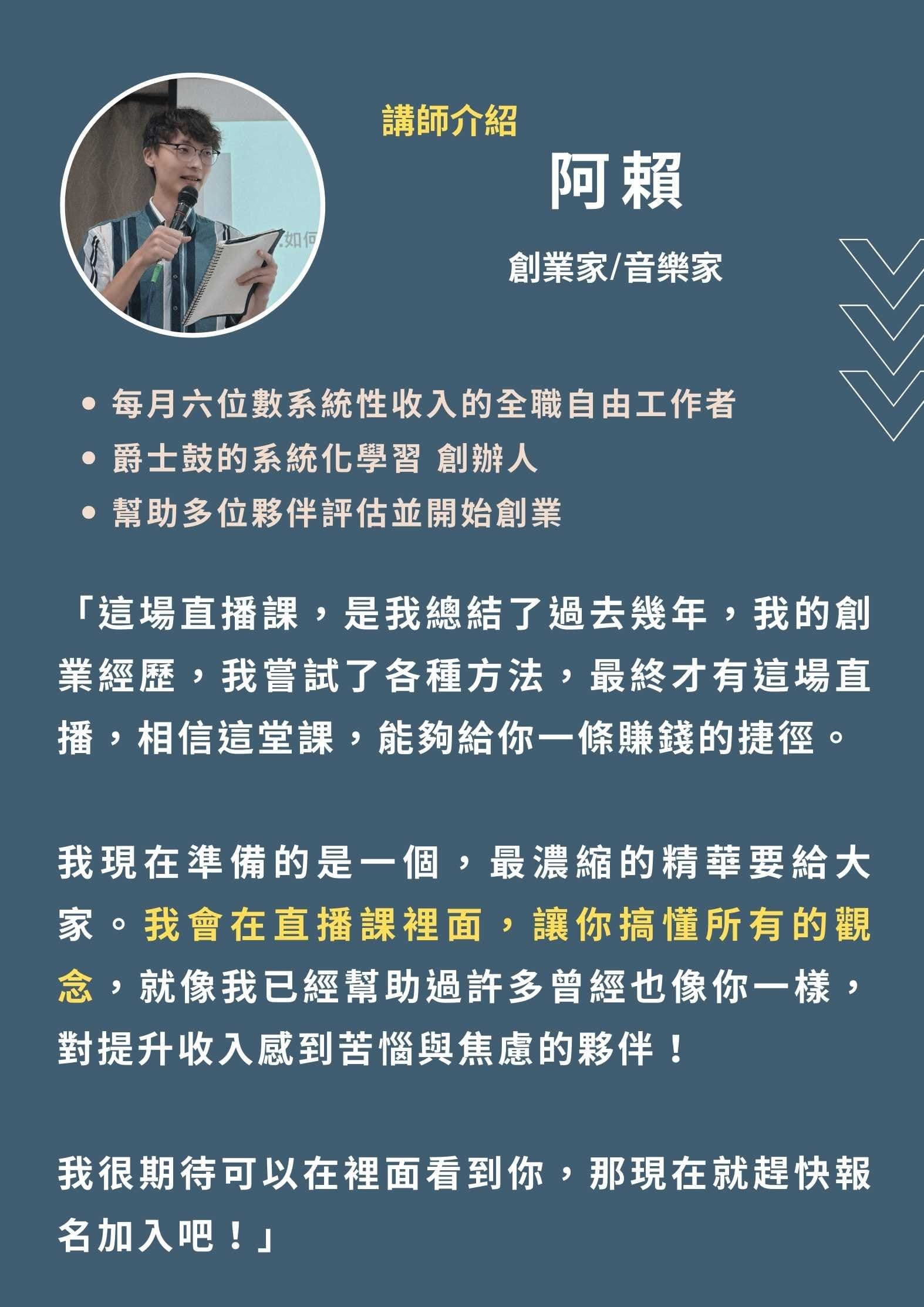 本頁面為賴在創業所有之原創內容。非任何官方宣傳頁面。收入潛力取決於個人的努力、時間投入、經營方式及市場條件等多種因素。如果你期望不付出努力就獲得快速致富的結果,請勿報名此課程。
